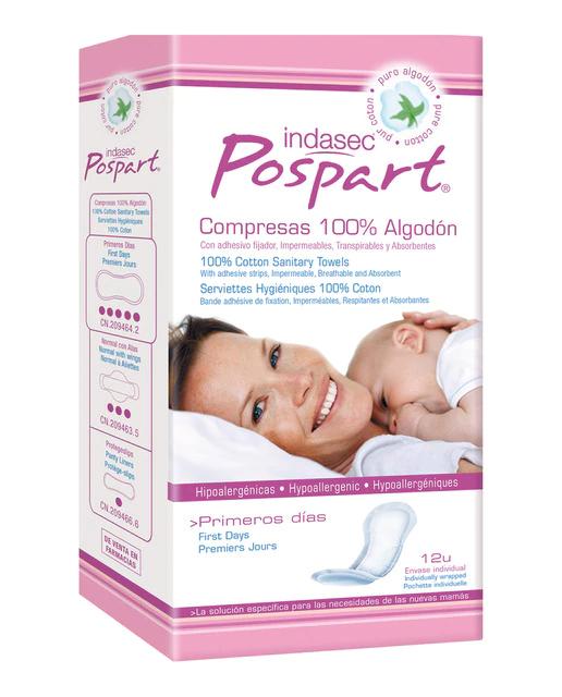 Las compresas 100% algodón Primeros días Indasec Pospart están diseñadas específicamente para absorber las pérdidas abundantes de los primeros días del posparto. Su composición de algodón puro 100% reduce el riesgo de infecciones, irritaciones y posibles alergias, ofreciendo una elevada suavidad para la piel. El entrelazado especial del algodón evita la adherencia de fibras en la herida.