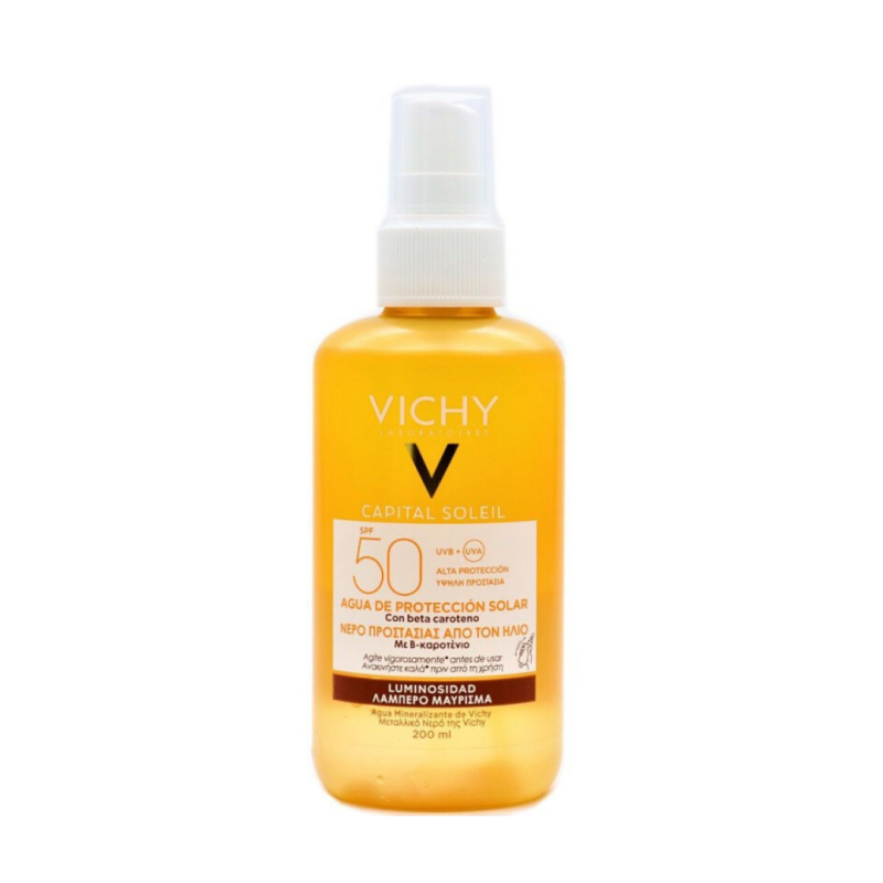 La Vichy Idéal Soleil Agua de Protección Solar Luminosidad SPF 50+ presenta una innovadora textura acuosa, ultra ligera y ultra fresca. Proporciona una protección UV de amplio espectro que deja la piel con una sensación fresca y limpia, sin ser pegajosa y sin dejar marcas blancas. Su fórmula está enriquecida con betacarotenos para promover un tono de piel uniforme y realzar el bronceado. Además, contiene ingredientes de origen natural.